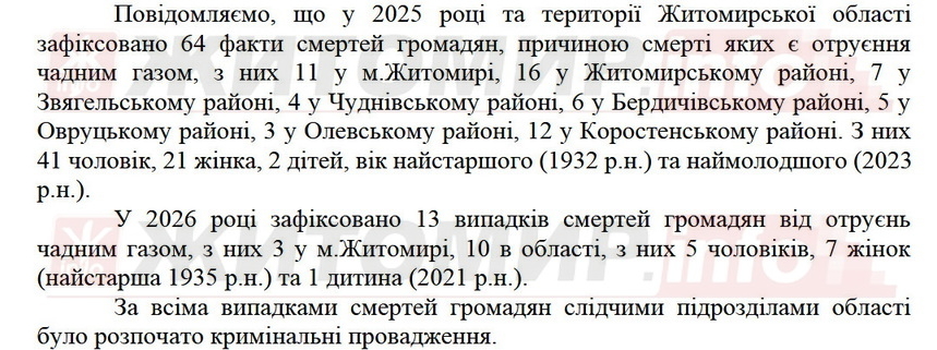 «У 2026 році зафіксовано 13 випадків смертей громадян від отруєнь чадним газом, з них 3 у м.Житомирі, 10 в області, з них 5 чоловіків, 7 жінок (найстарша 1935 р.н.) та 1 дитина (2021 р.н.). За всіма випадками смертей громадян слідчими підрозділами області було розпочато кримінальні провадження», - інформує поліції.
