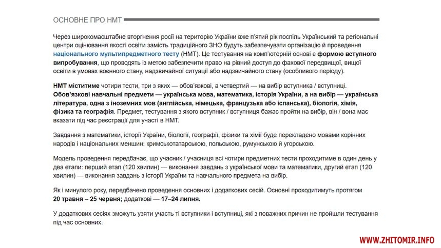 «Основні предмети: українська мова, математика та історія України. На вибір: українська література, іноземна мова (англійська, німецька, французька або іспанська), а також географія, біологія, хімія або фізика. Кожен учасник НМТ проходитиме тестування в один день у два етапи. Під час першого етапу, який триватиме 120 хвилин, учасник має виконати завдання з двох предметів: українська мова та математика. На другому етапі, який також триватиме 120 хвилин, потрібно буде виконати завдання з історії України та предмету на вибір. Між етапами передбачена перерва тривалістю 20 хвилин», – говорить заступниця директора департаменту освіти Житомирської міської ради Ірина Лавренчук.