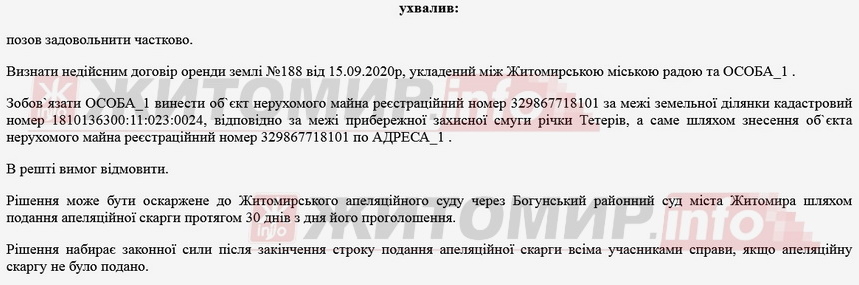 Суд позов задовольнив частково: визнав недійсним договір оренди землі №188 від 15.09.2020 р. та зобов’язав Ірину Медарь винести об’єкт нерухомого майна за межі земельної ділянки кадастровий номер 1810136300:11:023:0024, відповідно за межі прибережної захисної смуги річки Тетерів, а саме шляхом знесення об`єкта нерухомого майна.