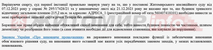 «Відповідачем суду не надано жодних належних доказів, що об`єкт незавершеного будівництва 11% готовності, який належить на праві власності відповідачу і знаходиться в прибережній захисній смузі р. Тетерів по пров. Річковий,19-б у м. Житомирі є спорудою гідротехнічного, навігаційного призначення або іншою спорудою, яка не підпадає під заборону, встановлену ст. 61 ЗК України», - йдеться у рішенні суду.
