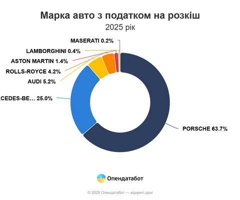 Кожен другий автомобіль у списку «розкішних» — Porsche Taycan: 232 авто. Загалом Porsche стали лідером luxury-сегменту із додатковим оподаткуванням: на авто цієї марки припадає 64% від загального обсягу. Ще чверть ринку зайняли Mercedes-Benz зі 126 авто. На решту преміальних марок разом припадає 11% ринку: Audi, Rolls-Royce, Aston Martin, Lamborghini, Maserati тощо.