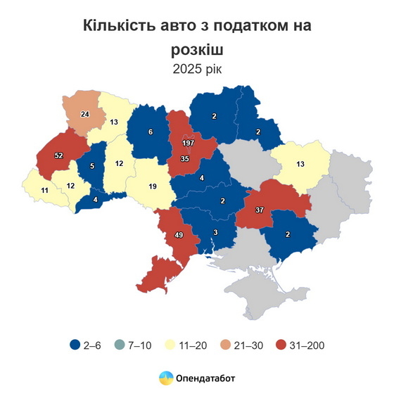 Майже половину всіх розкішних авто зареєстровано у Києві та області: 236 автівок. Ще 52 авто на Львівщині, 49 на Одещині та 37 автівок на Дніпропетровщині.