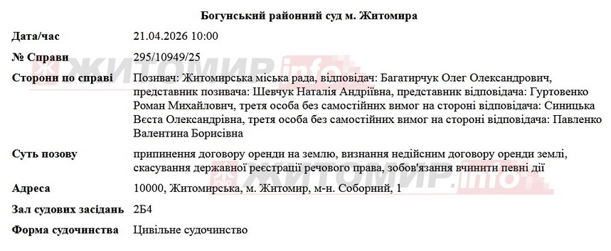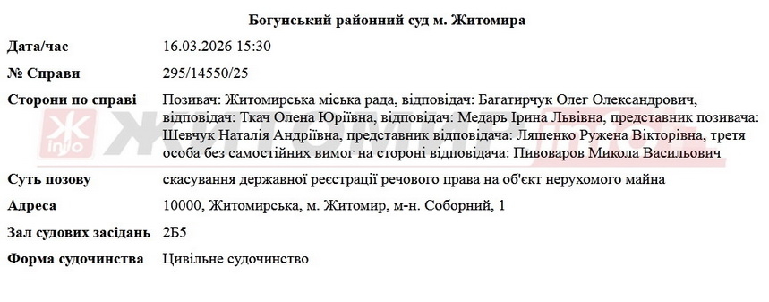 Нещодавно Житомир.info інформував про рішення Богунського райсуду від 11 лютого 2026 року, який частково задовольнив позов Житомирської міської ради: визнав недійсним договір оренди землі №188 від 15.09.2020 р. та зобов’язав Медарь Ірину Львівну винести об’єкт нерухомого майна за межі земельної ділянки кадастровий номер 1810136300:11:023:0024, відповідно за межі прибережної захисної смуги річки Тетерів, а саме шляхом знесення об`єкта нерухомого майна.