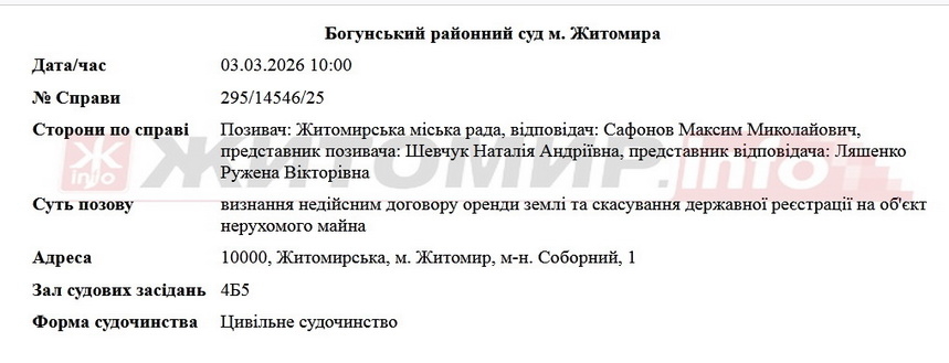 визнати недійсним договір оренди землі від 03.11.2022 № 99, укладений між Житомирською міською радою та ОСОБА_1;