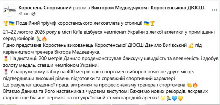 Зауважимо, на Facebook- сторінці відділу молоді та спорту виконкому Коростенської міської ради повідомили, що вихованець Коростенської ДЮСШ, легкоатлет Данило Вигівський, став чемпіоном України у бігу на дистанції 200 метрів, а у забігу на 400 метрів виборов друге місце.