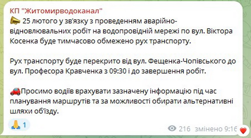 «25 лютого у зв’язку з аварійними роботами на водопровідній мережі на вул. Віктора Косенка, 14, КП «Житомирводоканал» перекриє проїжджу частину. Рух транспорту буде частково перекрито на ділянці від вул. Дмитра Донцова до вул. Професора Кравченка по вул. Віктора Косенка з 9:30 і до завершення робіт. Просимо водіїв врахувати це під час планування маршруту», - йдеться у повідомленні.