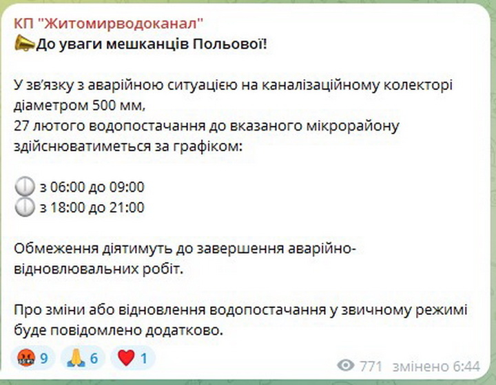 «У зв’язку з аварійною ситуацією на каналізаційному колекторі діаметром 500 мм, 27 лютого водопостачання до вказаного мікрорайону здійснюватиметься за графіком: