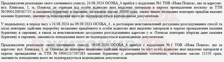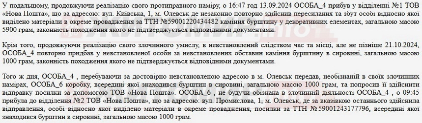 У матеріалах суду зазначається, що обвинувачений неодноразово купував у невстановленої особи каміння бурштину в сировині й пересилав «клієнтам» через відділення №1 ТОВ «Нова Пошта». Правоохоронці задокументували, що чоловік провадив таку діяльність з 12 серпня 2024 року до 21 жовтня 2024 року.