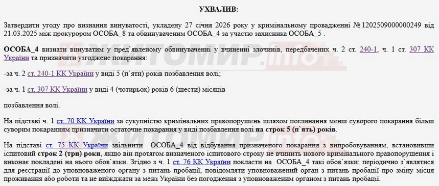 «27.01.2026 прокурор Коростенської окружної прокуратури у кримінальному провадженні ОСОБА_8 та обвинувачений ОСОБА_4 за участю захисника ОСОБА_5 уклали угоду про визнання винуватості. Відповідно до цієї угоди, обвинувачений ОСОБА_4 під час досудового розслідування повністю визнав свою вину у вчиненні інкримінованого йому кримінального правопорушення і зобов`язується беззастережно визнати обвинувачення в повному обсязі у судовому провадженні. Домовленості щодо співпраці обвинуваченого ОСОБА_4 у викритті кримінального правопорушення, вчиненого іншою особою, місця не мали», - йдеться у вироку суду.