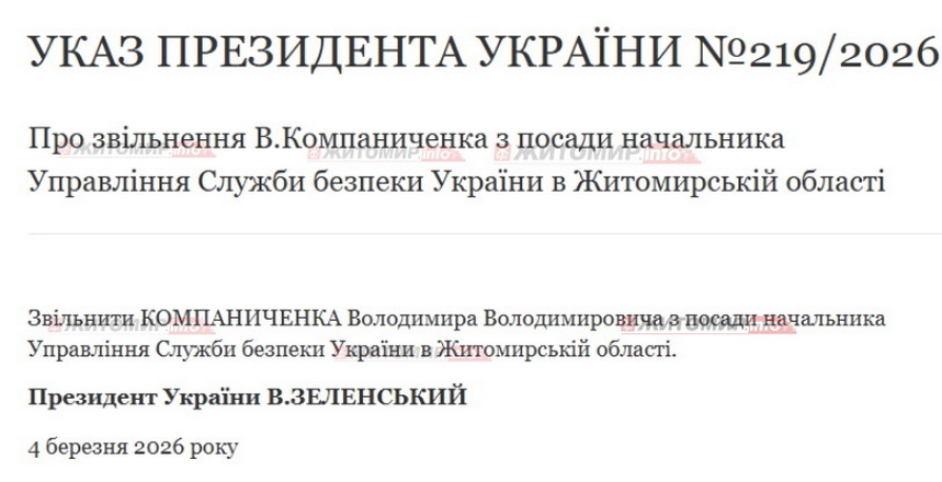 Президент України Володимир Зеленський 4 березня звільнив Володимира Компаниченка з посади начальника Служби безпеки України у Житомирській області.