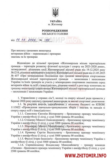 Про це йдеться у розпорядженні міського голови «Про виплату грошових винагород ветеранам війни – переможцям і призерам змагань та їх тренерам» від 3 березня, яке підписала секретар міськради Галина Шиманська.