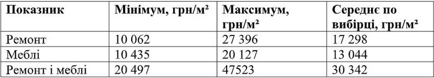Якщо оцінювати об’єкт у комплексі, тобто рахувати ремонт і меблі разом, показник по вибірці становив від 20 497 до 47 523 грн/м².