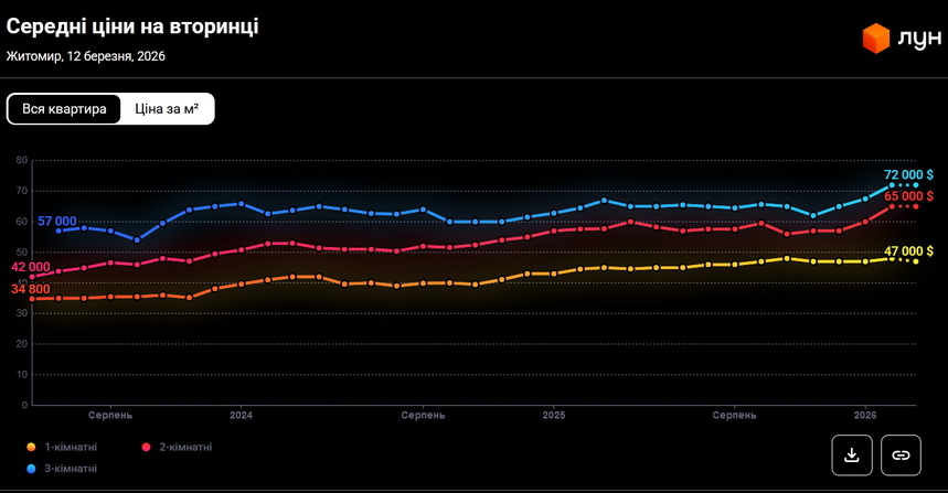 Щодо «вторинки», то на початку лютого середня вартість квартир у Житомирі продовжувала зростати, найбільше за останні пів року додали в ціні двокімнатні квартири до +13% у доларах, ціна на однокімнатні становила 47,5 тис. доларів. При цьому станом на 12 березня 2026 року вартість 1 кв.м квартир на вторинному ринку була 1030-1120 доларів (45-49 тис. грн).