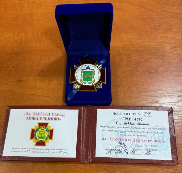 В жовтні 2025 року Гринчук повідомив, що йому вручили відзнаку «За заслуги перед Вижниччиною»: