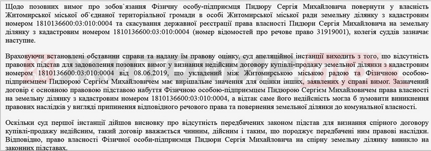 «Суд апеляційної інстанції дійшов висновку про неможливість задоволення позову в частині визнання недійсним договору купівлі-продажу земельної ділянки з кадастровим номером 1810136600:03:010:0004 від 08.06.2019, що укладений між Житомирською міською радою та Фізичною особою-підприємцем Пидюрою Сергієм Михайловичем з огляду на критерії сумісності заходу втручання у право на мирне володіння майном із гарантіями статті 1 Першого протоколу до Конвенції, сформульовані в усталеній практиці ЄСПЛ», - йдеться в постанові суду.
