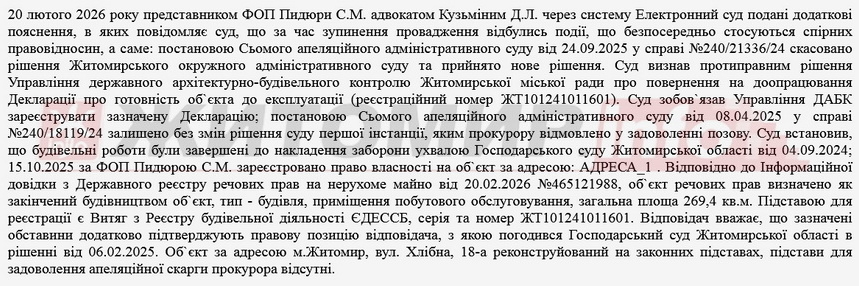 Зауважимо, що адвокат Пидюри надав апеляційному суду інформацію про виграні справи щодо будівництва павільйону булі Житнього ринку, зокрема – про зобов’язання управління державного архітектурно-будівельного контролю Житомирської міської ради зареєструвати декларацію про готовність до експлуатації об`єкта «Реконструкція торгівельного павільйону під приміщення побутового обслуговування за адресою: м. Житомир, вул. Хлібна, 18-а».