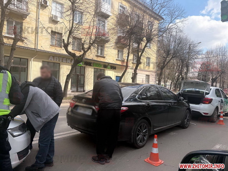 На вулиці Великій Бердичівській навпроти ЖК «Бульвар» у Житомирі вранці 20 березня сталась ДТП: зіткнулись Toyota та автомобіль служби таксі «Bolt».