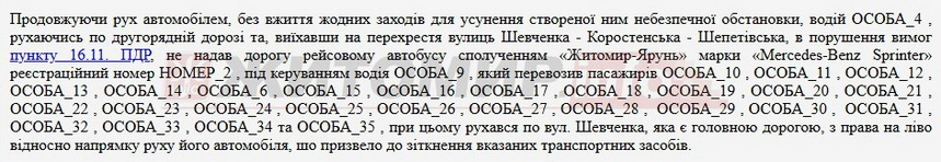 У матеріалах суду зазначається, що подія сталась 11 вересня 2025 року близько 9:20 год. Обвинувачений рухався на автомоюбілі «Volvo ХС90» по вул. Коростенській у напрямку вулиці Шепетівської. Наближаючись до нерегульованого перехрестя, чоловік порушив правила дорожнього руху, проявив неуважність, не простежив за дорожньою обстановкою та її змінами й проігнорував вимоги дорожнього знаку «Дати дорогу», у результаті чого допустив зіткнення з рейсовим автобусом сполученням «Житомир-Ярунь».