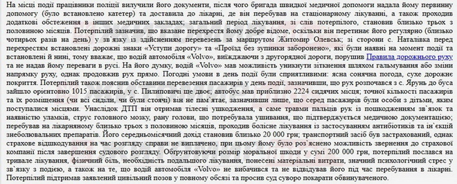 Водій мікроавтобуса розповів у судовому засіданні, що на момент події він рухався головною дорогою зі швидкістю не більше 50 км/год. Він побачив ліворуч легковий автомобіль марки «Volvo», який наближався з боку с. Наталівка та почав зменшувати швидкість, у зв`язку з чим він продовжив рух, розцінивши такі дії як надання йому переваги. Однак безпосередньо на перехресті вказаний автомобіль раптово збільшив швидкість руху, яку потерпілий орієнтовно оцінює як понад 70-80 км/год, у зв`язку з чим він здійснив маневр вправо та одночасно застосував гальмування, проте уникнути зіткнення не вдалося. Внаслідок ДТП бус перекинувся, пасажири вибивали вікна та самостійно залишали салон транспортного засобу.