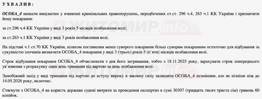 Відтак, суд визнав чоловіка винним у вчинені правопорушень за ч.4 ст.296 ККУ (Хуліганство) та ч. 1 ст. 263 ККУ (Незаконне поводження зі зброєю, бойовими припасами або вибуховими речовинами) та призначив покарання у вигляді позбавлення волі на строк 3 роки 5 місяців.