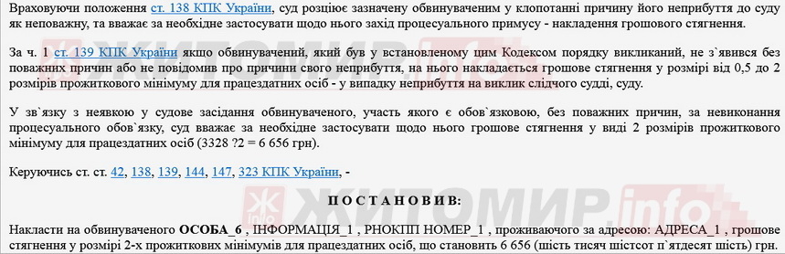 Суд розцінив зазначену обвинуваченим причину неприбуття до суду як неповажну й вирішив застосувати до Юрія Мойсеєва захід процесуального примусу – накладення грошового стягнення. 6656 грн мають бути сплачені в дохід держави, ухвала оскарженню не підлягає.