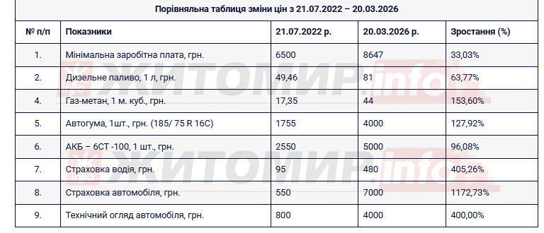 З огляду на порівняльну таблицю зміни цін та вартості послуг свідчать про значне зростання витрат: