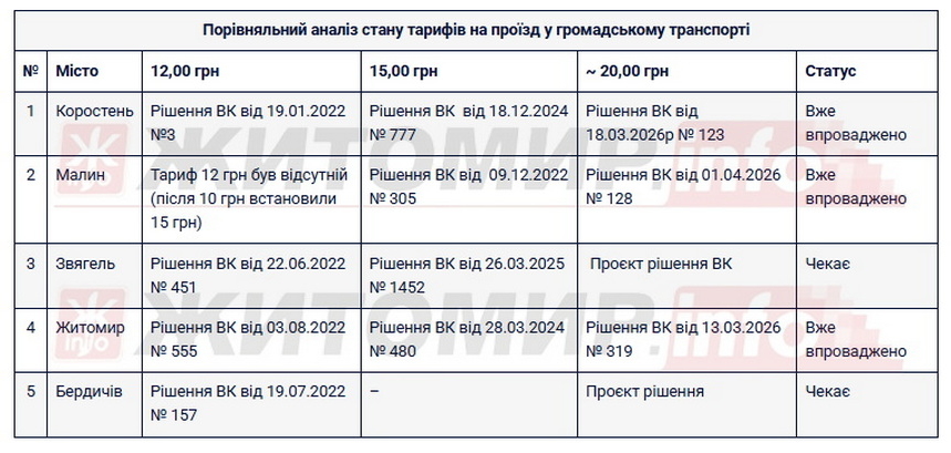 За результатами проведеного порівняльного аналізу тарифної політики в межах Житомирської області встановлено обґрунтованість розрахунків щодо перегляду вартості проїзду. Згідно з актуальними економічними показниками, територіальні громади Житомирщини вже привели тарифні плани у відповідність до фактичних витрат. Зокрема, міста Коростень, Звягель, Малин та Житомир здійснили перехід на тариф у розмірі 15 грн протягом 2024–2025 років. Станом на сьогодні в містах Житомир, Коростень та Малин уже впроваджено й діє тариф на рівні 20 грн за одну поїздку. У місті Звягель розрахунковий показник перебуває на стадії реалізації згідно з проєктом рішення виконавчого комітету у квітні 2026 року (ред. станом на час публікації).