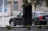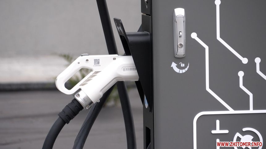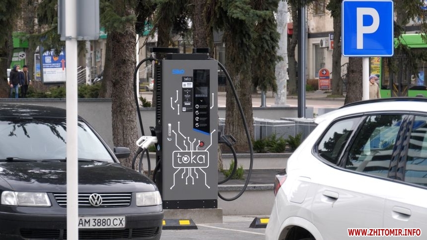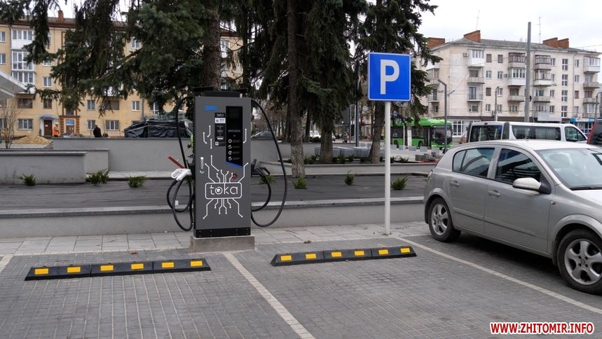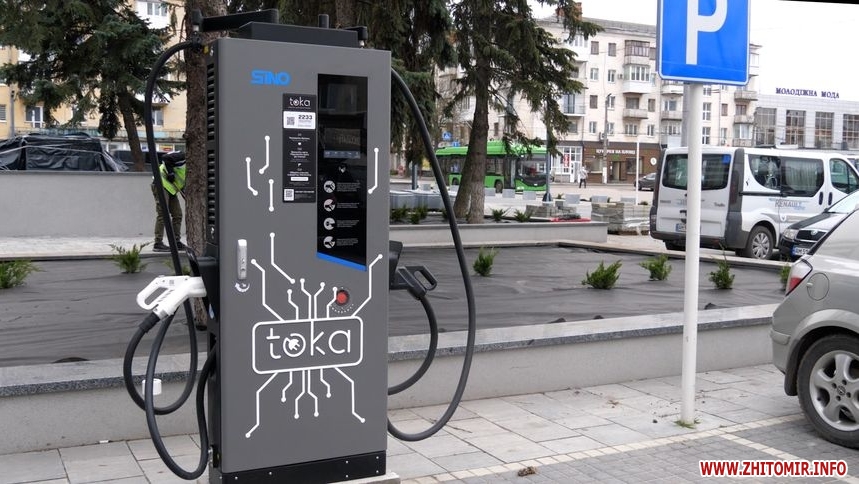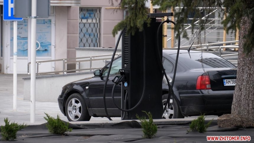 У центрі Житомира біля готелю встановили станцію зарядки електромобілів. Станом на 10 квітня на території проводять благоустрій та встановили обладнання на паркомісцях. Електрозаправка поки не працює.