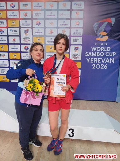 «Віолетта Кумечко — бронзова призерка Кубка світу з боротьби самбо! 11–12 квітня 2026 року в місті Єреван (Вірменія) відбувся Кубок світу з боротьби самбо серед чоловіків та жінок. У змаганнях взяли участь понад 300 спортсменів із 21 країни світу. Віолетта Кумечко, вихованка ДЮСШ Житомира, продемонструвала високий рівень підготовки, витримку та справжній бойовий характер, виборовши почесне 3 місце. Щиро вітаємо Віолетту та її тренерів — Олену Кумечко й Людмилу Новицьку — із вагомим досягненням на міжнародній арені», - йдеться у повідомленні.
