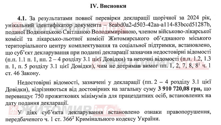 Загальна сума недостовірних відомостей в декларації Світлани Водяницької становить 3 млн 910 тис. 720,08 грн, що є ознакою кримінального правопорушення, передбаченого ст. 366-2 КК України (Декларування недостовірної інформації).