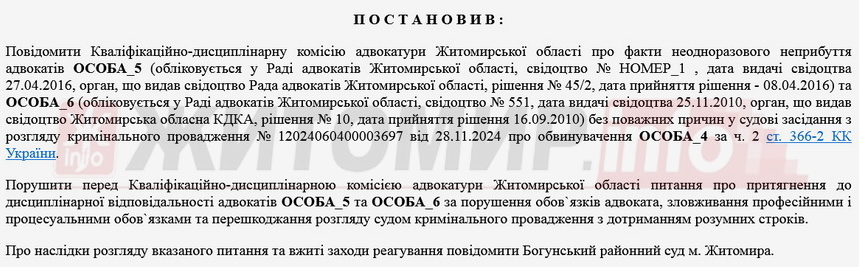 Богунський районний суд м.Житомира вирішив повідомити Кваліфікаційно-дисциплінарну комісію адвокатури Житомирської області про факти неодноразового неприбуття адвокатів депутата міської ради Юрія Мойсеєва на судові засідання та порушити перед комісією адвокатури питання про притягнення до дисциплінарної відповідальності обох адвокатів.