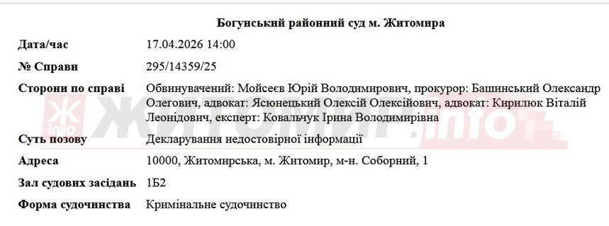 Нагадаємо, ухвалою від 27 березня 2026 року Богунський районний суд наклав на обвинуваченого у декларуванні недостовірної інформації депутата міської ради Юрія Мойсеєва грошове стягнення у розмірі 6 656 грн через ігнорування судового засідання.