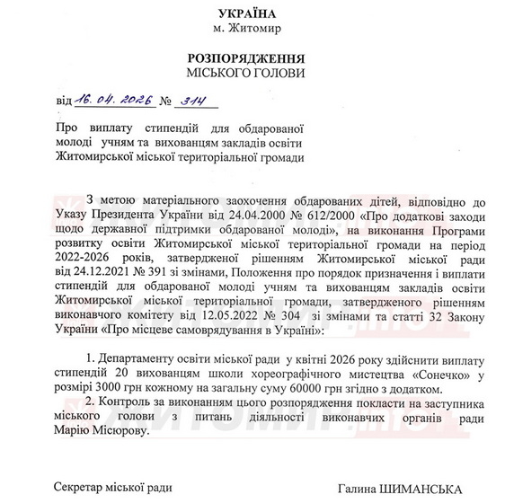 Про це йдеться у розпорядженні «Про виплату стипендій для обдарованої молоді учням та вихованцям закладів освіти Житомирської міської територіальної громади», яке підписала секретар Житомирської міської ради Галина Шиманська.