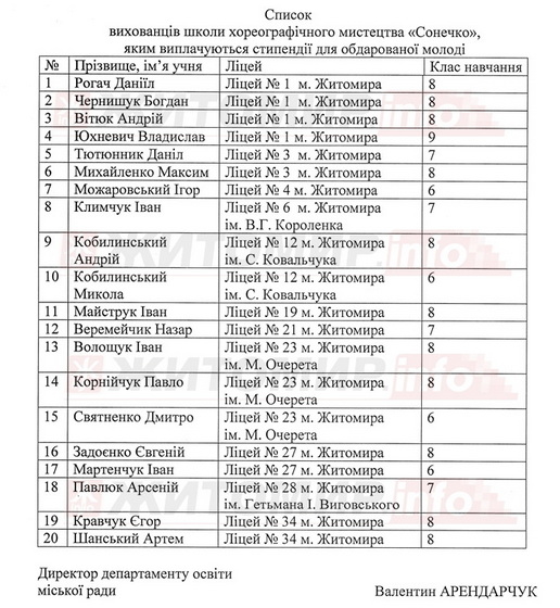 Як повідомляв Житомир.info, у Житомирі 23 обдарованих учні та 20 вихованців школи хореографічного мистецтва «Сонечко» призначили стипендії загальною сумою 83 тис. грн. Таке розпорядження 13 вересня 2023 року підписав міський голова Сергій Сухомлин.