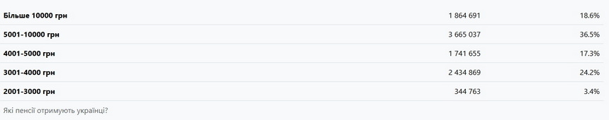 Найбільше пенсіонерів отримують від 5 до 10 тисяч гривень — це 3,66 мільйона осіб або 36% від загальної кількості. Середня пенсія в цій категорії — 6 686 гривень, а частка таких пенсіонерів збільшилась з 29% до 36%.