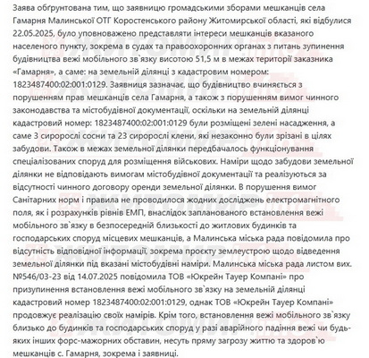 У справі також фігурує позиція Малинської міської ради. Зокрема, виконком раніше повідомляв про відсутність у нього проєкту землеустрою щодо цієї ділянки, а у липні 2025 року міськрада зверталася до компанії з вимогою призупинити встановлення вежі . Попри це, за твердженням заявниці, реалізація проєкту тривала.