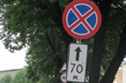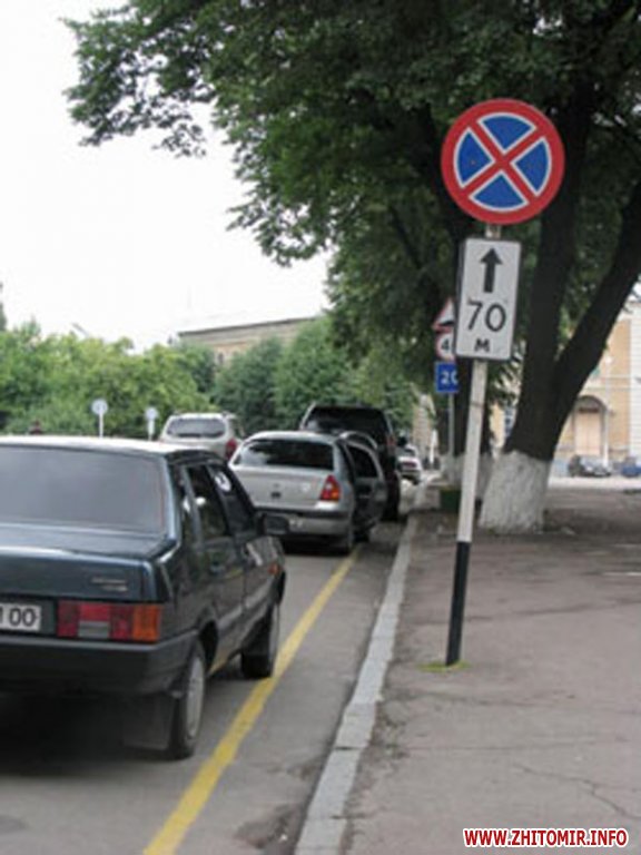 Біля Житомирської обдержадміністрації діє знак, який забороняє стоянку і зупинку автомобілів в ближчі сімдесят метрів. Цей знак підкріплений ще й горизонтальною розміткою у вигляді суцільної жовтої лінії. Проте це не заважає чиновникам так зухвало порушувати дорожні правила.