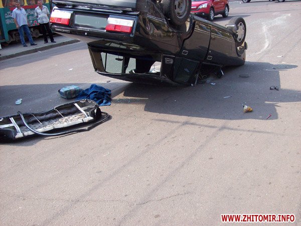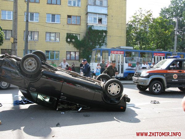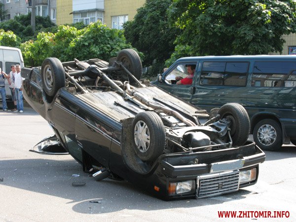 Жигули и иномарка попали в ДТП в Житомире на перекрестке улиц Московской - Котовского 12 августа после обеда . Чудом обошлось без жертв. В первой машине находилось трое мужчин, во второй - молодая мама с маленьким ребенком. По словам очевидцев, Жигули ударилась в иномарку, после чего по - каскадерски много раз перевернулась в воздухе, а дальше проехали несколько метров в перевернутом состоянии, на крыше, точнее.