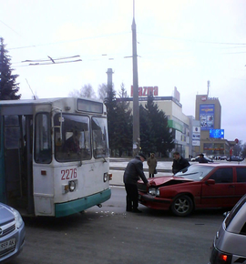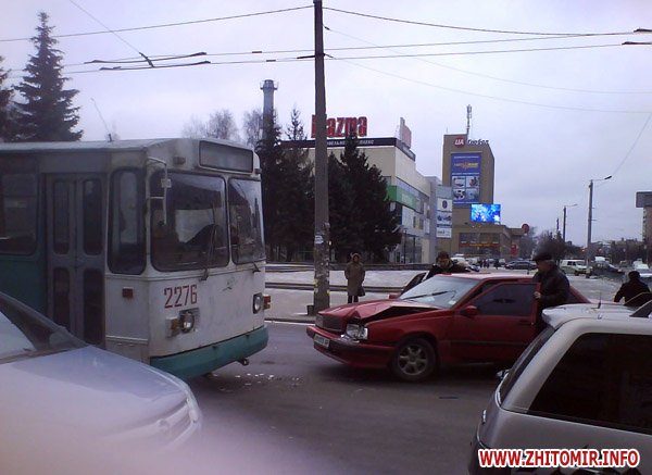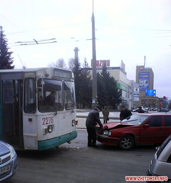 Сьогодні, у Житомирі на перехресті центральних вулиць Київської та Східної зіштовхнулися тролейбус та легкова автівка „Вольво”.