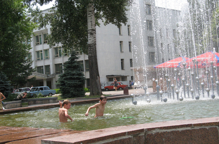 Так уж сложилось, что все население центральных улиц в районе Бульвара в возрасте от 6 до 16 лет время от времени устраивает в фонтанах массовые купания. Например, сегодня в прохладных водах фонтана около областной библиотеки плескалась компания мальчишек лет 8-9.