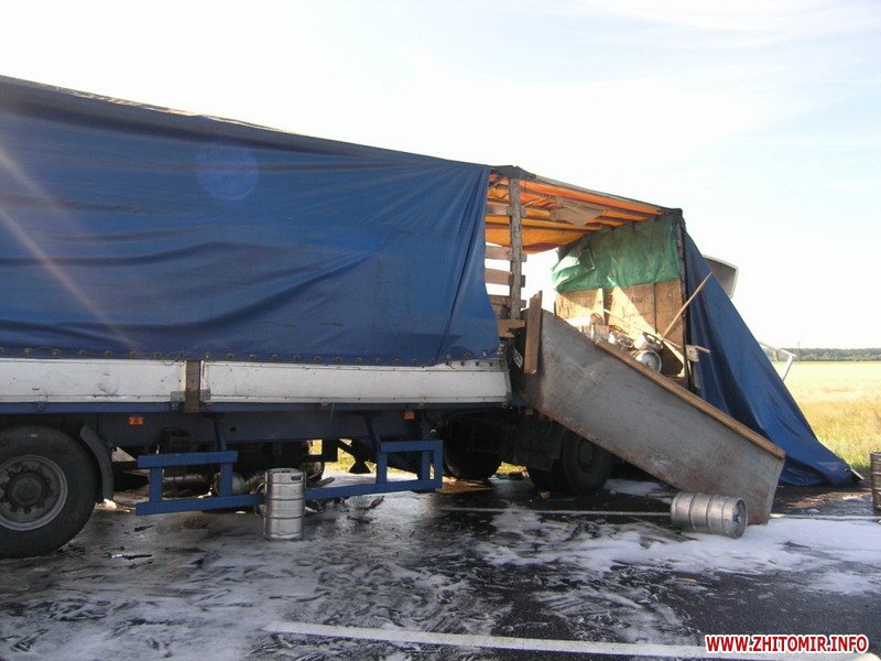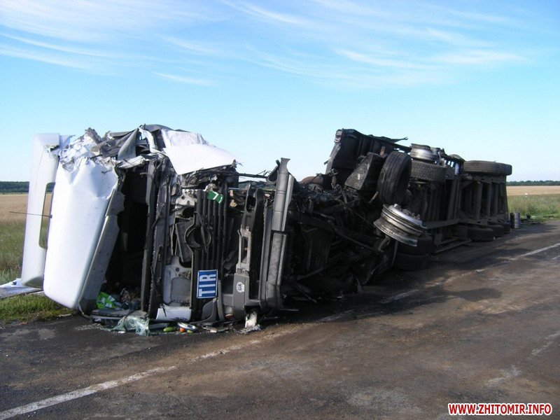 Как сообщила Житомир.info пресс-служба Госавтоинспекции Житомирской области, в тот день около 05.30 на 135 км автодороги Киев - Чоп, поблизости с. Вересы, Житомирского района, 42-летний водитель грузового автомобиля МАЗ-543205, житель Полтавской области, двигаясь в направлении г.Ровно, не справился с управлением, выехал на полосу встречного движения, где совершил столкновение с грузовым автомобилем Мерседес-1840, под управлением 26-летнего жителя Закарпатской области, который двигался во встречном направлении.