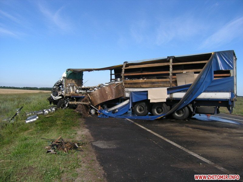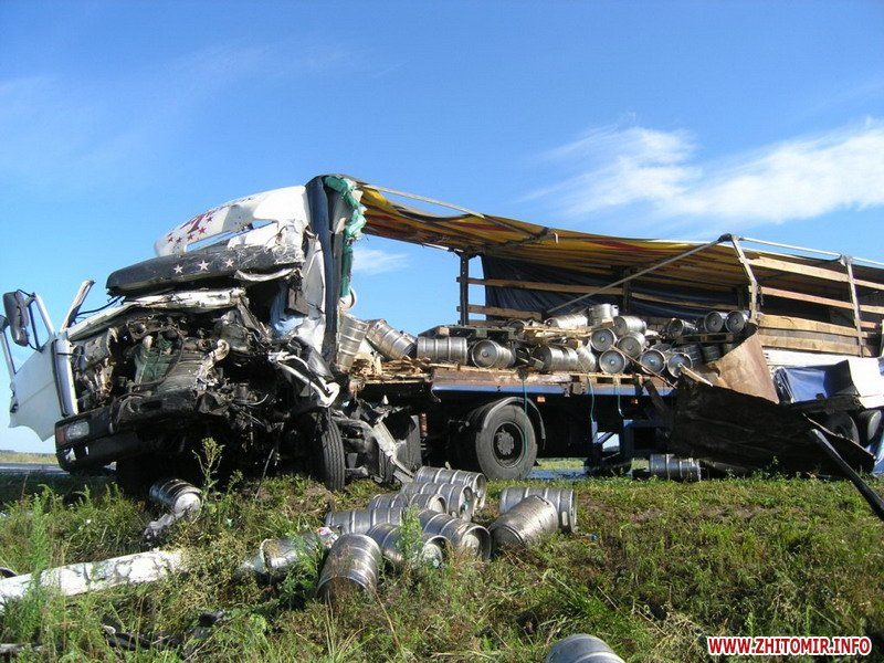 Как сообщила Житомир.info пресс-служба УМВД Украины в Житомирской области, в тот день 42-летний водитель грузового автомобиля МАЗ-543205, житель Полтавской области, двигаясь в направлении г.Ровно, не справился с управлением, выехал на полосу встречного движения, где совершил столкновение с грузовым автомобилем Мерседес-1840, под управлением 26-летнего жителя Закарпатской области, который двигался во встречном направлении.