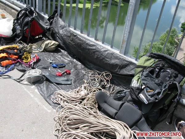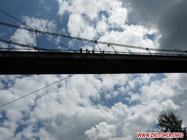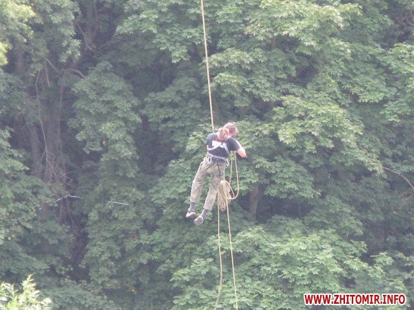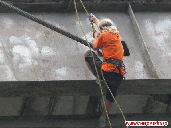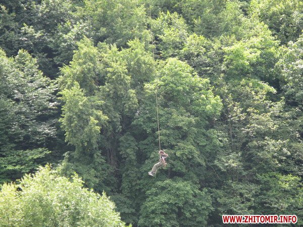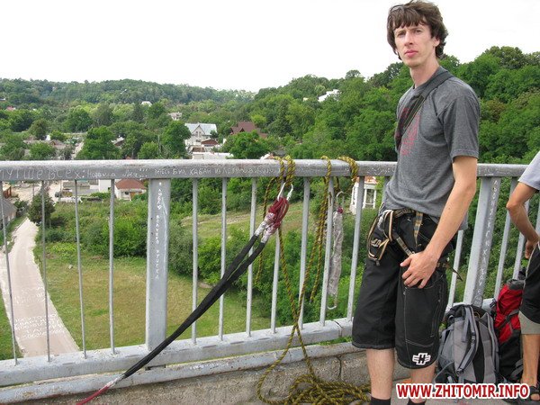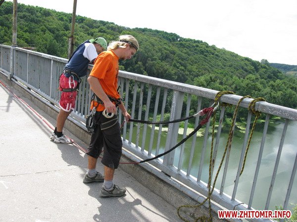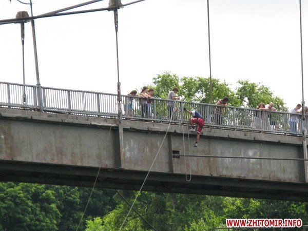 Сегодня, 31 июля, в Житомире на мосту в парке культуры и отдыха имени Юрия Гагарина начался Второй Международный Rope Jumping Фестиваль, который продлится до 2 августа. На фестиваль приехали несколько десятков участников из Украины, в частности из Киева, Запорожья и Днепропетровска, а также Белоруссии. Участники фестиваля – «драйвовые» парни и девушки в первый день фестиваля совершали головокружительные прыжки с верёвкой (rope jumping) с житомирского моста высотой 40м, который считается уникальным в Украине и адекватно подходящим для этого экстремального увлечения.