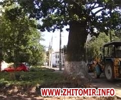 Цей зелений красень – один з найстаріших в місті Житомирі. Таких дубів можна хіба що на пальцях перелічити. Проте, рука людини ні перед чим не зупиниться. Аби розширити площі брокбізнесбанку, будівельні роботи проводяться біля самісінького дерева, й вже пошкоджено кореневу систему. Будівельники кажуть, що роблять лише свою роботу. На будівництво є всі дозволи, зокрема й міського управління з благоустрою. Пояснити ситуацію, що склалася, керівник банківської установи відмовився. Працівники ж обласної екологічної інспекції намагаються врятувати дерево. Проте, чи вдасться?