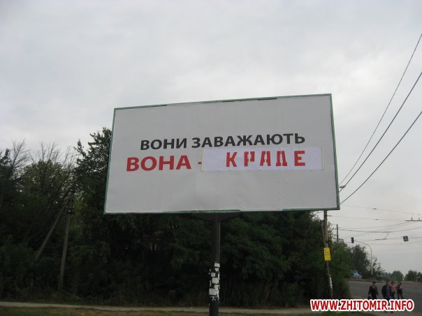 В Житомире горжане (или же активисты общественных организаций, партий и т.д.) решили немного поправить содержание биллборда, которое изначально гласило «Вони заважають – вона працює». Житомиряне нашли время и остальные средства (длинную лестницу, например), чтобы справить ошибку в рекламе размещенную на рекламе. Кто-то „заменил” слово працює на краде… Не известно кого потянуло на столь отчаянный шаг. Но сможет ли таинственный житомирянин заклеить все биллбоды в городе? В общем, избирательная кампания уже на подходе, каждый политик уже начал рекламировать себя, а украинцы начали реагировать на это, вот и результат…
