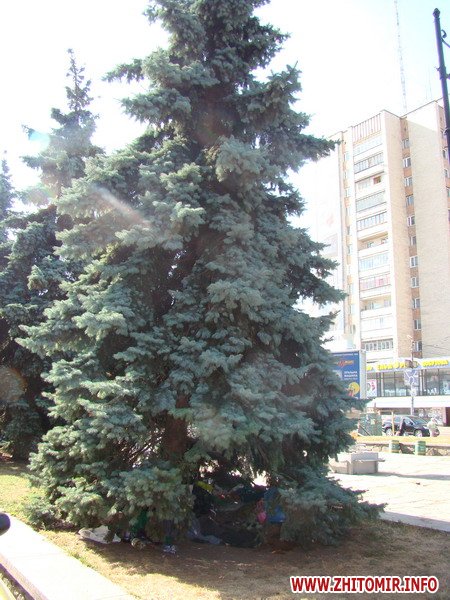 Под одной из голубых елей в сквере на Соборной площади в Житомире, где завершается строительство свето-музыкального фонтана, нашли приют бомжи.