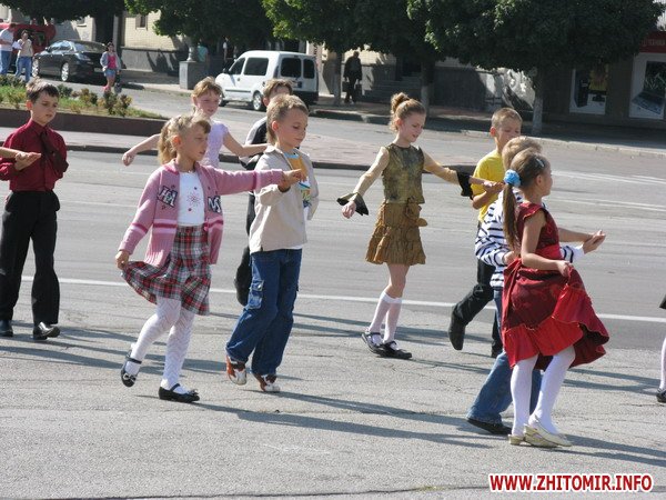 В центре города Житомира, на Соборном майдане сегодня, 9 сентября, проходят репетиции детских танцевальных коллективов. Дети отрабатывают танцевальные композиции, с которыми выступят в дни празднования 1125-летия города Житомира 11-13 сентября.