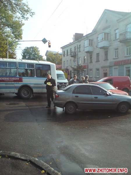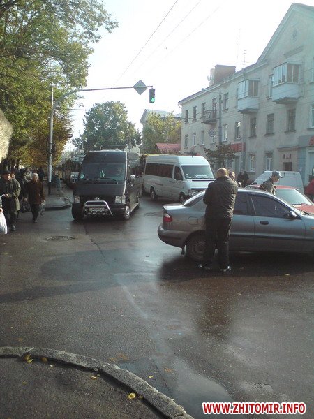 Около 10 часов утра 8 октября на перекрестке улиц Киевской и Шелушкова в Житомире произошла авария. В центре перекрестка столкнулись два легковых автомобиля. Обошлось без серьезных повреждений. Водители, судя по всему, тоже остались целы и невредимы. Чуть позже к месту происшествия подъехали сотрудники ГАИ.
