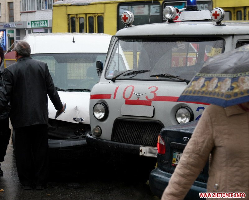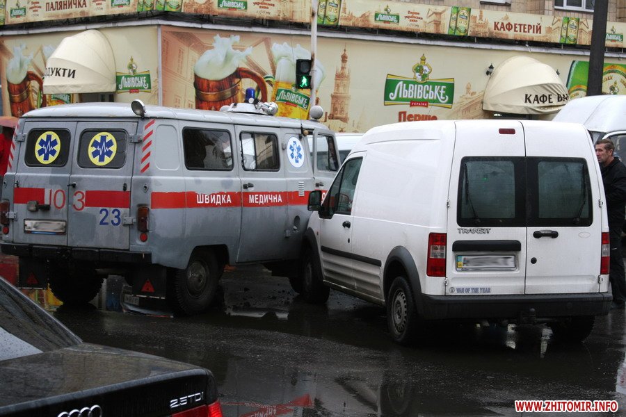 В Житомире на одной из центральных улиц в час пик (около 9 часов утра) произошло ДТП. На перекрестке улиц Киевской и Восточной столкнулись Ford Transit и машина скорой помощи, старенький УАЗ. Причины происшествия непонятны, да и взволнованным водителям автомобилей было не до объяснений. Но, как рассказали опытные водители, причинами являются плохие погодные условия и большое количество транспорта на дороге. И, конечно же, человеческий фактор: кто-то зазевался, а кто-то спешил. Как сообщал Житомир.info, в начале августа 2009 года три автомобиля не поделили дорогу. На улице Победы, неподалеку от школы номер 7, столкнулись три автомобиля - два легковых и карета скорой помощи.