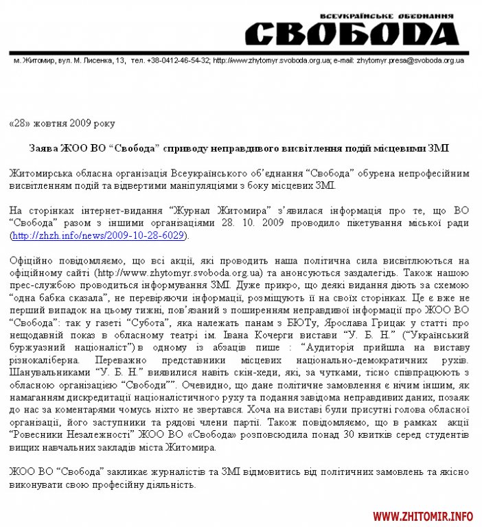 На страницах интернет-издания "Журнал Житомира" появилась информация о том, что ВО "Свобода" совместно с другими организациями 28. 10. 2009 проводило пикетирование городского совета
